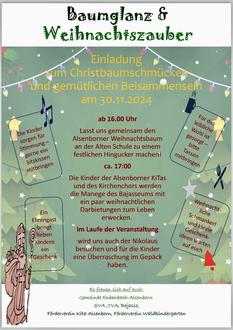 Wir laden alle Bürger, die schon in Weihnachtsstimmung sind oder kommen wollen, herzlich zu einem weihnachtlichen Event am 30.11.24 ab 16 Uhr in der Dorfmitte in Alsenborn ein. Gemeinsam mit den Kindern der Alsenborner KiTas wollen wir unseren prächtigen Weihnachtsbaum an der Alten Schule zum Strahlen bringen. Anschließend werden gegenüber in der Manege des Zirkusmuseums einige Weihnachtliche Klänge angestimmt. Die Vereine sorgen für das leibliche Wohl, kleine Präsentideen und etwas Rahmenprogramm. Bringen Sie gerne eine Tasse für den Glühwein und ein Sitzkissen für die Darbietungen mit. Wir freuen uns auf etwas Weihnachtszauber und ein paar gesellige Stunden mit Ihnen!