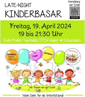 Es ist wieder soweit. Der Förderverein öffnet seine Türen zum ersten Late Night Basar. Am Freitag, den 19.04.2024 von 19:00 – 21:30 Uhr habt ihr die Möglichkeit in der TPSV Halle in Enkenbach bei gemütlicher Atmosphäre mit kühlen Getränken und Snacks zu shoppen was das Zeug hält.