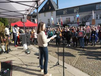 Als Hauptrednerin unterstrich Landrätin Cornelia Weigand: „Wir, die Frauen dieser Welt, haben viel erreicht auf dem Weg zur Gleichberechtigung in Wirtschaft, Politik und Gesellschaft. Einer Gleichberechtigung, die selbstverständlich sein sollte. Gemeinsam stehen wir heute hier, weil diese Errungenschaften in Gefahr sind. Weil dieser Dreiklang aus Würde, Gleichheit und Gleichberechtigung in Gefahr ist. Weil die DNA unseres Grundgesetzes in Gefahr ist.“ Rechtspopulisten würden einfache Feindbilder aufbauen sowie „Migration als Gefahr von außen für unsere Gesellschaft und Feminismus als Gefahr von innen“ darstellen. Rückwärtsgewandte Vorstellungen von den Geschlechtern würden propagiert. „Wir Frauen sollen in enge Rollenbilder gezwängt werden, und unsere Freiheit soll einschränkt werden“, klagte Weigand an.