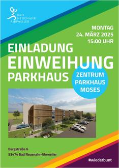 Nach rund einem Jahr Bauzeit wird am Montag, 24. März um 15 Uhr, das Zentrum-Parkhaus Moses offiziell eröffnet. Damit stehen zukünftig in zentraler Lage im Stadtteil Bad Neuenahr rund 400 weitere Stellplätze für alle Interessengruppen zur Verfügung. Mit dem neuen Parkhaus soll die Parksituation im Innenstadtbereich entspannt und der Einzelhandels-, Dienstleistungs- und Wirtschaftsstandort Bad Neuenahr-Ahrweiler weiter gestärkt werden.