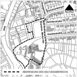 Im Westen wird das Plangebiet von einem Fußweg und Böschungen entlang der Ahr sowie Rebflächen begrenzt, während im Norden ein Gartenbaubetrieb und Wohnhäuser angrenzen. Die östliche Grenze wird durch die Blandine-Merten-Straße markiert. Südlich schließen sich Schulflächen (Gymnasium, Realschule) an.