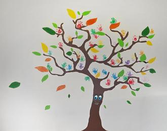 Jeder Handabdruck eine Erinnerung: Der bunte Baum mit den Handabdrücken aller Kinder, die die Kita besucht haben.