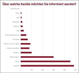 Mit 42 Prozent fühlt sich weniger als die Hälfte ausreichend über den aktuellen Stand des Wiederaufbaus informiert. Bei den jüngeren Teilnehmern unter 30 Jahren waren es dagegen nur 22 Prozent. Als bevorzugte Informationskanäle wurden Facebook, die Presse sowie das Aufbau-Magazin genannt.