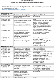 | 15-17 Uhr | Familienbildungsstätte, HdF/MGH: | Offener Eltern-Kind-Treff am MGH „Walk & Play“. Infos: Tel. 02641 / 27039 |