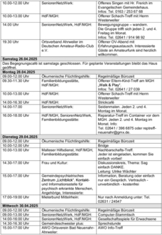 | 10-12 Uhr | HdF/MGH, SeniorenNetzWerk: | Deutsche Schlager der 60er/70er Jahre zum Mitsingen mit Jürgen Schick. Jeder ist eingeladen, kommen Sie einfach vorbei, singen Sie mit! |