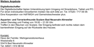 | 13.30-15.30 Uhr | Pflegestützpunkt Bad Neuenahr-Ahrweiler/ Grafschaft: | Offene Sprechstunde |