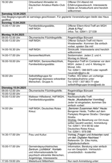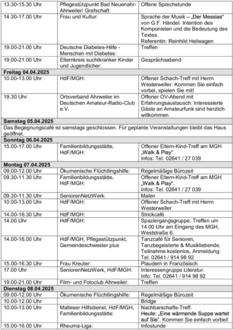 | 16.30-18 Uhr | Selbsthilfegruppe für Menschen mit psychischer Belastung: | Treffen. Infos: MGH, Tel. 02641 / 9149892 |