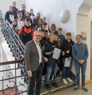 www.bad-neuenahr-ahrweiler.de - Die teilnehmenden Jugendlichen mit dem Ersten Beigeordnen Peter Diewald (l.) im Treppenhaus des Mehrgenerationenhauses.