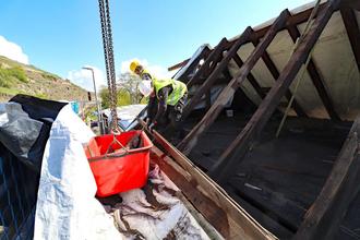 Die Zimmerleute des Museums tragen das Dach des Walportheimer Bahnhofs ab.