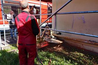 Eine Spezialfirma zerschneidet die Wände des Walportheimer Bahnhofs um ihn so in Teilen nach Kommern transportieren zu können.