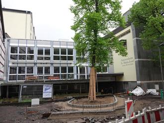 Überall Baustellen: vorne die Niederhutstraße, dahinter St. Maria-Josef.