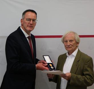 Innenminister Ebling (l.) überreicht die Rettungsmedaille des Landes an Joachim Wieczorek.