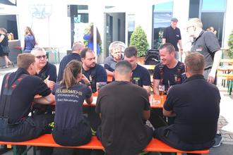 HEIMERSHEIM. GW. Petrus meinte es gut mit den Floriansjüngern der Freiwilligen Feuerwehr Heimersheim: Zwei Tage lang Kaiserwetter mit strahlendem Sonnenschein. Trotz Champions.League-Finale im Fernsehen am Samstagabend konnte sich die Freiwillige Feuerwehr Heimersheim bei ihrem Wochenend-Feuerwehrfest über einen großen Besucherandrang freuen. Der Flachsmarkt als neuer Standort der Feuerwehr löste 2022 den angestammten Roten Platz als Feiermeile ab. 40 aktive Feuerwehrleute, darunter drei Frauen, und deren Angehörige kümmerten sich um das Wohl der Gäste. Pommes, Würstchen und vor allem der legendäre Holzkohlen-Spießbraten am neuen elektrischen Drehgrill, der über zwei Stunden als Premiere zur Garzeit rotierte, waren die kulinarischen Favoriten. Viele befreundete Feuerwehrlöschzüge aus der Stadt und Region fanden den Weg zum Feuerwehrstandort mit seinen neuen Gebäuden, der im März 2021 bezogen wurde und auch im Juli 2021 von der Flut betroffen war. „Bis auf einige Malerarbeiten ist aber alles wieder hergerichtet“, so Carsten Retterath, der seit zwei Jahren als Löschgruppenführer agiert. Der Fuhrpark besteht aus einem LF-Katastrophenschutzfahrzeug, einem Einsatzleiter-, einem Tanklösch- und einem Löschfahrzeug. „Wir sind mit unserem neuen Standort sehr zufrieden und viel schneller am Einsatzort, insbesondere auf der Autobahn“, so Retterath. Auch viele junge Familien fanden den Weg zum Feuerwehrfest. Das Spieleparadies für die Kleinen war die große Hüpfburg. Samstagabend präsentierte das neue „No-name-Musikensemble“ mit Dirk Schoenmackers, Andreas Hoss, Rebecca Schoenmackers, Michael "Momo" Ley und Christian "Bob" Ley eine Perlenkette bekannter Lieder der Rock- und Popgeschichte. Die Musiker*innen interpretieren in ihrem Programm Hits aus den letzten sieben Jahrzehnten überwiegend mit akustischen Gitarren, Bass und Percussion. Am Samstagabend standen auf der Setliste Oldies von BAP, Simon and Garfunkel, Credence Clearwater Revival, aber auch aktuelle gute Laune-Hits von Ed Sheeran, Melanie Fiona, George Ezra und The Boss Hoss. So erklangen kölsche Evergreens wie "Verdamp lang her", "Do kanns zaubere", "Bickendorfer Büdchen" und "Leev Marie" als auch"Who`ll stop the rain" (Credence Clearwater Revival), der legendäre Fußballstadionhit "Sweet Caroline" (Neil Diamond ) und "Vincent" (Sarah Conner). Auch am Sonntag glänzte das goldene Dach der Fahrzeughalle in der Sonne, als der Musikverein Niederheckenbach zum Frühschoppen aufspielte. "Die Ortsbezeichnung „Auf dem Flachsmarkt“ hat uns inspiriert, die Eigenschaften eines Flachsfeldes auf die Gestaltung des Gebäudes zu übertragen: Die gelb-goldene Farbe steht für den „reifen“ Flachs. Die unregelmäßigen Abstände der Falze zwischen den Metallbahnen symbolisiert die einzelnen Flachshalme. Das „wertvolle“ Erscheinungsbild soll auch eine Wertschätzung für die „wertvolle“ und ehrenamtliche Arbeit der Feuerwehrleute darstellen," so Architekt Michael Unger auf Anfrage der Stadtzeitung. Die Dicke-Backen-Musik aus der Eifel mit exzellenter Blasmusik fand ein begeistertes Publikum. Interessierte Besucher konnten sich von den Heimersheimer Floriansjüngern durch das Gebäude führen lassen und den Fuhrpark besichtigen. Mit einem reichhaltigen Kuchenbuffet klang das Feuerwehrfest am Sonntagnachmittag als Familientag aus. Für 2024 plant die im Jahre 1912 gegründete Freiwillige Feuerwehr Heimersheim ein an die Notrufnummer 112 angelehntes "Jubiläum".