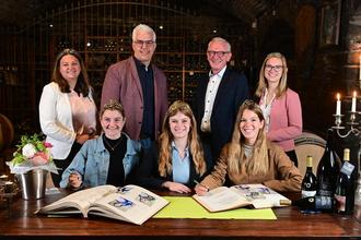 Eintrag in zwei Goldene Bücher in der Winzergenossenschaft Mayschoß/Altenahr: (v. l.) Ahrweinkönigin Annabell Stodden, die Deutsche Weinprinzessin Katharina Gräff, Bürgermeister Dominik Gieler, die Deutsche Weinkönigin Charlotte Weihl, Bürgermeister Guido Orthen, die Deutsche Weinprinzessin Julia Lambrich und Ahrweinprinzessin Laura Nietgen.