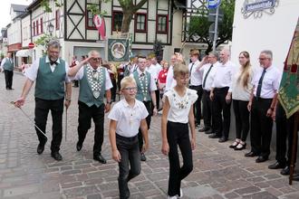 Hauptmann Helmut Beu (li) begleitet die Majestäten bei der Parade, vorne weg die Geschwister Jan und Angelina Dreßen.