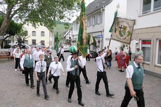 Am Sonntag, 18. Juni, stand dann das diesjährige Schützenfest auf dem Programm. Eingeladen waren die befreundeten Bruderschaften aus dem Bezirk „Rhein-Ahr“ Bad Bodendorf, Heppingen, Löhndorf, Königsfeld, Kripp, Sinzig und Westum. Das Fest startete um 14 Uhr mit dem Empfang der Gastvereine und der traditionellen Parade auf dem Marktplatz in Heimersheim. Anschließend zog der Festzug zum Schützenplatz. wo nach der Festansprache des Brudermeisters mit Begrüßung der Ehrengäste aus dem Bezirk „Rhein-Ahr“, den örtlichen Majestäten und der Totenehrung die Schießwettbewerbe begannen.