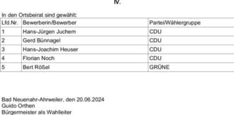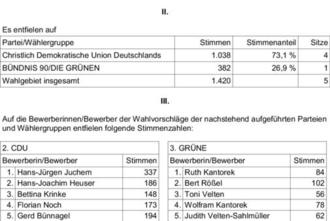 Der Wahlausschuss hat in seiner Sitzung am 13.06.2024 das Ergebnis der Wahl zum Ortsbeirat wie folgt festgestellt: