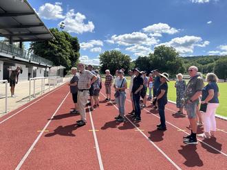 Zunächst steuerte die Gruppe den Mittelplatz an, der mit Kunstrasen ausgestattet wurde und seit Sommer 2023 bereits wieder bespielt wird. Es folgten der Hauptplatz mit Rasenfläche und Leichtathletikbahnen sowie die Haupttribüne mit sanierten Umkleiden, Kiosk und weiteren Räumlichkeiten. Dieser erste Bauabschnitt ist bereits abgeschlossen, der Hauptplatz seit 2024 wieder in Benutzung. Mit Blick auf den zweiten, aktuell laufenden Bauabschnitt stellten die beiden Referenten das Sportheim bei einem kleinen Durchgang durch die Räume vor, und erläuterten die dazugehörigen Pläne. Der Baustart des dritten Abschnitts wird Ende des laufenden/Anfang des kommenden Jahres folgen. Er beinhaltet den Westplatz sowie die Westtribüne.