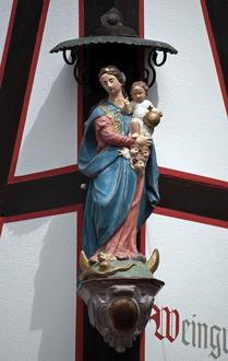 An der rechten Seite des Gebäudes hängt eine Barockfigur (Bild Nr. 4). Diese stellt die Muttergottes mit dem Jesuskind dar, das in der linken Hand die Weltkugel und in der Rechten früher eine Rose trug. Unter den Füßen des Jesuskindes sind die Köpfe von drei Engelsputten zu sehen. Die Muttergottes steht auf einer Mondsichel und zertritt eine Schlange. Der Sockel der Statue zeigt einen guten Barockstil. Ursprünglich befand sich über der Madonna, wie bei Markt Nr. 4 (Marktbrunnen), eine vergoldete Muschel. Durch die Erschütterungen beim Bombenangriff am 29. Januar 1945 löste sich die Statue und fiel auf die Straße. Gott sei Dank hatte sie keine größeren Schäden. So ist sie auch heute noch eine Zierde des Hauses bzw. des Marktplatzes.