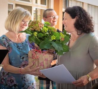 Linda Meier erhält Blumen und Dankesworte zum Abschied von Kathrin Römermann