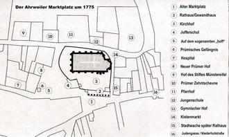 Der Marktplatz in Ahrweiler lag auf Prümer Herrenland unmittelbar am Zusammenstoß der vier Hauptstraßen, die von den vier Stadttoren ausgehen (siehe Plan). Es ist schwierig, sich ein genaues Bild über das Aussehen und die Bebauung des mittelalterlichen Marktes zu machen. Eine wissenschaftliche Auswertung des aus dem 14. Jahrhundert stammenden Grundbuches der Stadt Ahrweiler ist noch nicht erfolgt und würde bestimmt neue Erkenntnisse bringen.