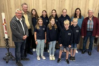Vorstandsmitglieder des Kapellenvereins freuen sich mit den Messdienerinnen und Messdienern über das neue Outfit