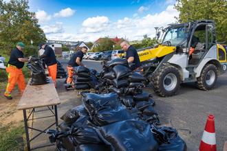 Mitarbeiter des städtischen Betriebshofs füllen Sandsäcke ab