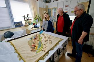 Die restaurierte Fahne hat auch eine sehr hübsche Rückseite (v.l.: Anna-Maja Lyko, Winfried Ley, Burkhard Hoffmann)