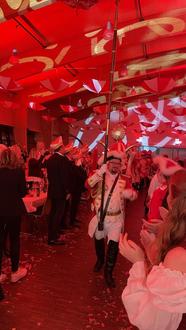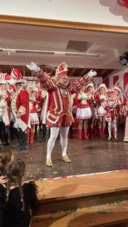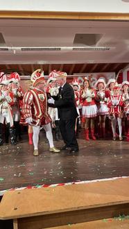 Dann wechselte der Elferrat und die Proklamationssitzung des großen Prinzen wurde eingeläutet. Das Publikum durfte sich zunächst auf einen Vortrag der Ahrtalblömsche alias Wolfgang Krupp und Rainer Groß freuen. Dann wurde es geheimnisvoll. Die schon auf dem Ankündigungsplakat in Aussicht gestellte Überraschung wurde vorbereitet: Ein breites schwarzes Stoffband verdeckte die Bühne, dunkle Gestalten standen im Gang mit leuchtenden Kugeln in den Händen. Dann eine Stimme aus dem Off, ein Zauberer erschien auf der Bühne - manch einer ahnte schon, was nun folgte: „Rio Palace“, die Showtanzgruppe unter Leitung von Marc Dombrowski ist nach sechsjähriger Pause wieder zurück auf der Bühne und präsentierte einen Show mit viel Glamour, Grazie, Phantasie und der gewohnten Präzision. 22 Tänzerinnen und der mittanzende Choreograph Marc verzauberten das Publikum und wurden ohne Zugabe auch nicht aus dem Saal gelassen. Musikalisch wurde der Abend außerdem durch die Gruppe „Jeckediz“ bereichert, die bei dieser Veranstaltung gar nicht mehr wegzudenken ist und nach kurzer Zeit den Saal fest im Griff hatte. Nach Ehrung verdienter und langjähriger KG-Mitglieder nahm der 70. Prinz sichtlich bewegt Abschied. In seiner Rede erinnerte er u.a. an seinen Vater Horst „Hoppy“ Holzem, der leider während seiner Prinzenregentschaft viel zu früh verstorben sei, aber es tröste ihn, dass dieser noch seine Proklamation und den Rosenmontagszug erlebt habe. Von seinem Adju Marcus Robrecht erhielt der scheidende Prinz ein großes Bild zum Abschied geschenkt, das die beiden bei der Proklamation vor einem Jahr zeigt.