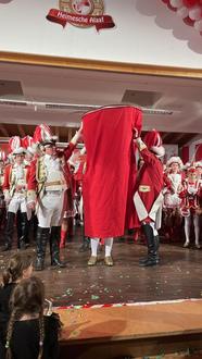 Nach einer kurzen Pause wurde es erneut spannend: Die neue Tollität wurde, noch fein verpackt, hereingeführt und unter großem Jubel auf der Bühne aus dem roten Sack gelassen: Neuer Prinz von Heimersheim ist der 41-jährige Florian I. (Welter), 1. Kassierer der KG und im zivilen Leben seines Zeichens Elektrotechniker-Meister. Als Adju steht ihm Rainer Groß zur Seite, der seinen Prinzen auch gleich sehr herzlich beglückwünschte. Auch Stadtoberhaupt Guido Orthen gratulierte dem neuen Prinzen und freute sich darüber, dass erneut die Tollität aus den Reihen der Handwerker stammte.