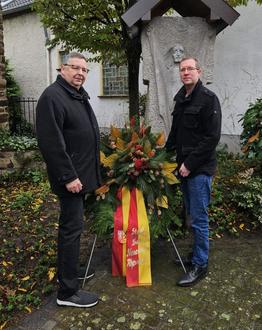 Ortsvorsteher Ulrich Stieber und Stellvertreter Johannes Stieber bei der Kranzniederlegung