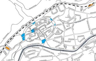 Abb. 2: Tarifzonen in Ahrweiler Dunkelblau: Parkplatzflächen in Tarifzone 2; Orange: Parkplatzflächen in Tarifzone 3; Ohne Farbkennzeichnung: Straßenbegleitendes Parken in Tarifzone 3