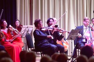 Orchester-Leiterin Ervis Gega (M.) übernahm persönlich den Part der Soloviolinistin.