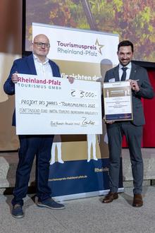 Nahmen stellvertretend für den Ahrtal-Tourismus den Tourismuspreis Rheinland-Pfalz für das Projekt des Jahres 2025, „Probier mal Ahrtal“, entgegen: Geschäftsführer Andreas Lambeck (l.) und Daniel Hempen vom Hotel Rodderhof als Vertreter der Gastgeber und Mitinitiator der Aktion.