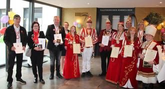 Sie hatte jede Menge Ehrungen im Gepäck. Zuerst erhielt das Dreigestirn, bestehend aus Prinzessin Alexandra I. Röhn, Bauer Erika I. Wolf und Jungfrau Sarah I. Knickmeier, sowie das Jugendprinzenpaar Prinzessin Sophia I. Jonas und Prinz Leon I. Rosenthal die Inthronisationsurkunden des RKK.