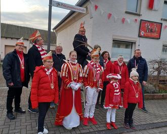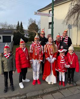 BACHEM. Bachems närrische Kindertollitäten, Prinz Maximilian I. und Prinzessin Nicole I., haben zahlreiche jecke Anordnungen in Paragrafenform getroffen. Paragraf 6 lautet: „Unser Bürgermeister Guido Orthen hat in Zusammenarbeit mit den Ortsvorstehern von Bachem, Uli Stieber, und Ferdi Heuwagen aus Ahrweiler dafür zu sorgen, dass unsere Heimatadressen für die Zeit unserer Regentschaft in Prinzessinnen- und Prinzenstraße geändert werden.“ Bürgermeister Orthen half mit seinem Mitarbeiterstab bei der stadtteilübergreifenden Umsetzung, so dass ab sofort die Kalvarienbergstraße in Ahrweiler und Bachems Himmelsburger Straße närrisch umbenannt sind. Mit Genugtuung enthüllten Bachems Kindertollitäten jetzt ihre Straßenschilder und erklärten die Umsetzung ihrer Regierungserklärung als erfüllt.