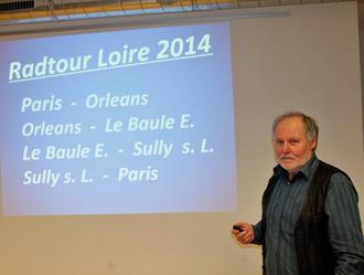 Mit einem kleinen Rundkurs in Paris, für den von der Ankunft am Morgen im Gare de L'Est bis zur Weiterfahrt nach Orleans vom Gare d' Austerlitz noch einige Stunden blieben, startete der Reisebericht. Der Place de la Republic, die typischen Stände an der Seine, Notre Dame, Place de la Concorde, dem Eiffelturm und viele weitere Sehenswürdigkeiten waren ein passender Anfang für den Ausflug entlang der Loire mit ihren insgesamt 42 Schlössern von Sully bis zur Mündung in Le Baule-Esoublac und Saint-Nazaire. "Mit dem Rad reist man langsamer, aber umso intensiver", erzählte Rehorn, der am Liebsten im Zelt übernachtet, in kleinen Cafés frühstückt und Land und Leute kennen lernt. "Orleans, die bedeutende Stadt mit wunderbaren Kathedralen, lässt einen den Mut der Baumeister bewundern", so Rehorn, der aber auch immer wieder die Loire selbst in ihrem ursprünglichen Bett in den Blickpunkt stellte. Mit den typischen Booten und Uferpromenaden, der lässigen Atmosphäre, den typischen Häusern, nimmt sie jeden Reisenden gefangen. Bis zur Mündung hat Horst Rehorn weit mehr als die "normalen" 400 Kilometer zurück gelegt, liegen die Schlösser doch nicht immer direkt an der Reiseroute. Wunderbare Architektur, herrliche Gärten und immer wieder große Namen, die von den Herrschern angezogen wurden, wie Leonardo da Vinci, bestimmen das Bild und lassen die historischen und kulturellen Highlights bis zum Atlantik genießen. Über Blois und Amboise ging es nach Tours, wo jedem gleich der Heilige Martin einfiel. Müßig, alle Ziele zu nennen - Horst Rehorn wusste mit seinen Bildern und Erzählungen ein Stück Frankreich zum Leben zu erwecken, das schöner nicht sein könnte. Insgesamt hat die Loire eine Länge von 1006 Kilometern und ist der Größte der in den Atlantik mündenden Ströme Frankreichs.