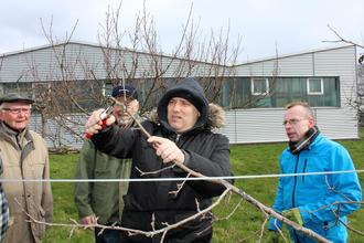 Die Zahl der Teilnehmer beim Obstbaumschnittkurs des Aßlarer Obst- und Gartenbauvereins war am Samstag zwar überschaubar, doch in der kleineren Gruppe konnten dafür intensiver Fragen beantwortet und Tipps gegeben werden. Die winterliche Witterung hatte wohl viele vom Kommen abgehalten. Der 2. Vorsitzende Horst Lampe hieß die Interessenten herzlich willkommen und unterstützte Baumfachwart Carsten Roth bei seinem Vortrag. Wie immer wurde zunächst das richtige Werkzeug präsentiert, das von der Tiroler Steigtanne (Einholmleiter), über Amboss- und Bypass-Schere, bis zur Astsäge reichte. "Obstbäume werden geschnitten, damit sie regelmäßig hochwertige Erträge bringen", so Roth. Bei jungen Bäumen kommen Formierarbeiten dazu, die Wachstum und Fruchtbarkeit direkt beeinflussen und einer Überbauung vorbeugen. So kann mehr Licht in die Krone einfallen, was den Krankheitsdruck reduziert und die Früchte besser ausfärben lässt. Mit den Baumerziehungsmaßnahmen wird ein Baum, oder Elemente davon - in eine gewünschte Form gebracht. Hilfsmittel sind Schnüre, Klammern, Spanner und Gewichte. Diese Eingriffe verlangsamen oder unterstützen die natürlichen Prozesse. Schnittzeitpunkte sind während der Vegetationsruhezeit im Winter, aber auch im Sommer, wenn der Baum belaubt ist. Im Winter wird eine Triebreaktion bewirkt und das Wurzelwerk bleibt unverändert, während ein Teil der Triebe weg geschnitten wird. Somit stehen für die restlichen Organe mehr Wasser und Nährstoffe zur Verfügung und die Triebe wachsen im kommenden Jahr stärker. Deshalb wird im Winter maßvoll und zweckmäßig geschnitten. Die Entfernung einzelner, eher grober Äste, lässt die Triebreaktion gemäßigt ausfallen - viele kleinere Eingriffe führen zu verstärkter Triebbildung. Bei jüngeren Bäumen erfolgt ein zurück haltender, gezielter Winterschnitt. Benutzt wird vorwiegend die Baumschere und man hält sich an das Prinzip, von oben nach unten und von außen nach innen zu schneiden. Grundsätzlich soll darauf geachtet werden, dass die Fruchtäste gut verteilt sind und eine gute Belichtung bekommen. Es soll kein Missverhältnis im Kronenaufbau entstehen. Wenn der Baum eine ideale Struktur hat, müssen keine Korrekturmaßnahmen vorgenommen werden. Sind allerdings einzelne Äste im oberen Bereich zu dick oder zu lang, werden sie am besten ganz entfernt. Auch Fruchtäste mit steilem Winkel, Astgabelungen oder zu schwere Seitenäste an Fruchtästen sollen konsequent entfernt werden, um der Überbauung entgegen zu wirken. Roth fasste die Schnitt- beziehungsweise Wuchsgesetze zusammen:
