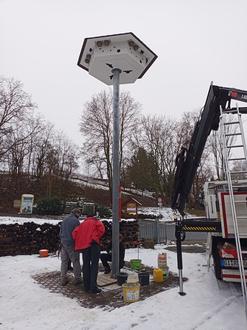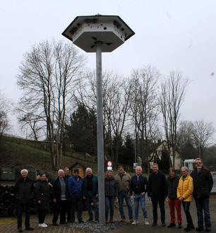 Der Aßlarer NABU-Ortsverband hat am Dienstagvormittag in Berghausen sein neuestes Projekt eingeweiht - ein Artenschutzhaus, das in luftiger Höhe einer ganzen Reihe Spezies Wohnraum bietet. "Der NABU Aßlar ist rührig unterwegs und hat nach dem geglückten Start mit Insektenhotels nun ein neues Projekt ins Leben gerufen", so Initiator Oliver Menz und nannte als Ziel, auch in anderen Stadtteilen Artenschutzhäuser zu etablieren. Rund 12000 Euro hat die rund 7 Meter hohe Konstruktion gekostet und wurde von der Firma agrofor in Wettenberg gebaut. "Durch Eigenleistung beim Aushub des Fundaments, den kostenlosen Standort auf dem Gelände von unserem Mitglied Sibylle Hahn sowie Spenden und Zuwendungen, konnten wir das Artenschutzhaus realisieren", so Menz weiter. Den größten Batzen steuerte mit 5000 Euro die Obere Naturschutzbehörde bei, die Stadt Aßlar gab einen Obolus und Wolfgang Keiner, Stefan und Valentin Huck von örtlichen Unternehmen beteiligten sich ebenfalls. "Im Laufe der Zeit wurden durch Sanierungen von Häusern die Nistmöglichkeiten für Fledermäuse und Mehlschwalben signifikant reduziert", erläuterte der 1. Vorsitzende Dr. Günter Moritz. Die Wärmedämmung verschließt jede Ritze und jeden Spalt, in denen von alters her diese Spezies ein Zuhause fanden. "Der Standort ist ideal gelagert, am Ortsrand und mit bestehenden Nestern nebenan, so dass wir ab Mai hier mit ordentlich Betrieb rechnen", führte Moritz weiter. Bürgermeister Christian Schwarz dankte dem NABU Aßlar für seine rege ehrenamtliche Tätigkeit für die Umwelt. "Ihr seid immer präsent, habt immer neue Ideen und ich finde es schön, dass auch Berghäuser Firmen mit ihrer Unterstützung ihre Verbundenheit zu ihrem Standort unterstreichen", so Schwarz. "Wir sind hier doch noch sehr ländlich geprägt und die Nähe zur Natur um uns herum, macht unser Städtchen erst lebenswert." Schwarz erzählte von den Fledermäusen, deren Anwesenheit er an Sommerabenden in seinem Hausgarten genießt: "Das ist einfach ein tolles Erlebnis!" Deshalb müsse man auch unbedingt versuchen, den Rückgang von Nistmöglichkeiten zu kompensieren, erläuterte Menz. "Wir haben hier einen Weg gefunden, das alte Kulturgut der Mehlschwalben zu erhalten." Rauchschwalben seien nur noch in der Landwirtschaft vorhanden. Das neue sechseckige Artenschutzhaus bietet je zwölf Brutkammern für Mauersegler und Sperlinge, zwölf Mehlschwalbeneinzelnester, je drei Brutkammern für Stare und Nischenbrüter wie den Hausrotschwanz, drei Fledermauskasten für Spalten bewohnende Arten sowie drei Fledermausquartiere für Hohlraum bewohnende Arten. Da das Artenschutzhaus gut sichtbar in der Nähe des Künftigen Dorfplatzes stationiert ist, haben die Berghäuser:innen einen guten Einblick, wenn der Frühling kommt und die neue Bewohner Einzug halten.