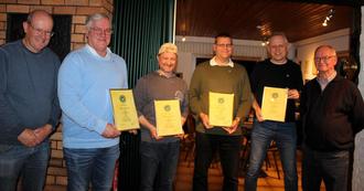 Heinz Rücker (re) und Jürgen Speier (li) ehrten Roger Thumm, Björn Banzhof, Uwe Cernohorsky und Dirk Hederich.