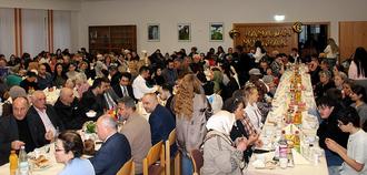 Der Imam Herr Süleyman informierte über die Hintergründe des Ramadan: "Der Ramadan ist ein gesegneter Monat und eine wichtige Zeit für die Muslime, weil der Koran in der Nacht der Bestimmung hinab gereicht wurde, der die Menschheit ins Licht führt." Dazu gehöre das obligatorische Fasten von Sonnenaufgang bis -untergang. "Ramadan ist ein Monat der Geduld und der Belohnung mit dem Paradies. Am Anfang ist er Gnade, in der Mitte Barmherzigkeit und zum Ende die Rettung vom Höllenfeuer." Im Ramadan geht es um gute Taten, teilen, geben und die Anhebung des gesellschaftlichen Bewusstseins. Das Fasten lehrt Selbstbeherrschung, reinigt die Seele, man nimmt seelische Nahrung auf und die Zeit wird mehr wert. "Ich wünsche im Ramadan Frieden, Freude, Glückseligkeit und Zufriedenheit für die ganze Welt", so Süleyman. Prädikant Patrick Stübiger sprach über Gemeinsamkeiten mit dem Christentum, das zwei Fastenzeiten kennt. "Zum einen im Advent zur Buße und in der Erwartung Gottes, und zum anderen in der Passionszeit, den 40 Tagen zwischen Aschermittwoch und Ostern", so Stübiger. Traditionell wurde auf Fleische verzichtet - Fisch durfte verzehrt werden. In der Reformationszeit sei das Fasten aus der Mode gekommen. "Für die Reformatoren war es nicht ehrlich, zu denken, man braucht nur zu fasten und alles wird gut." Leider ging ein Teil der Ansprache in der allgemeinen Unruhe unter, da die Zeit des Fastenbrechens schnell näher rückte und in diesem Augenblick die verspätete Generalkonsulin Nagihan İlknur Akdevelioğlu eintraf. So trug eine Schülergruppe der Grundschule Aßlar um Dilara Türe noch ein Gedicht über den segensreichen Ramadan vor, während das Essen gereicht wurde, und weitere Programmpunkte folgten. Auch die Generalkonsulin freute sich in ihrem Grußwort über diese Veranstaltung, die mit der großen Resonanz von 250 Gästen das beispielhafte Miteinander der Kulturen in Aßlar unterstreiche. Abschließend wurden Spenden gesammelt, die "Charly und Lotte", der Trauerbegleitung für Kinder und Jugendliche, zu Gute kommt, die von der Hospiz Mittelhessen gGmbH, dem Haus Emmaus, kostenlos angeboten wird.