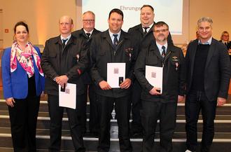 Staatliche Ehrungen führten den Ehrungsmarathon an: V.l. Katharina Schäfer, Sebastian Bourcarde, Dirk Schumacher, Sebastian Rieger, Michael Pichl, Andreas schmied und Christian Schwarz.