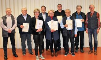 Ehrungen waren der Höhepunkt der Jahreshauptversammlung des Musikvereins: V.l. Eberhard Scholz, Willi Heidrich, Heike SChlicht, Jürgen Kasteleiner, Adelheid Seibel, Kersten Becker, Willi Schneider, Erhard Henrich und Ulrich Seibel.