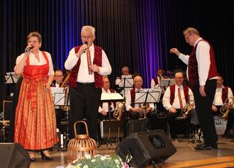 Am Sonntagnachmittag spielte in der Aßlarer Stadthalle Robert Payers Original Burgenlandkapelle auf und ließ das Publikum in hervorragender Blasmusik schwelgen. "Kersten Becker vom Kulturamt und ich haben überlegt, was wir Euch mal Neues hier in der Halle präsentieren können", erläuterte Timo Groos, Schlagzeuger mehrerer Formationen und Inhaber von E.MP Egerland.Musikproduktionen, die Hintergründe der Veranstaltung bei der Begrüßung. Am Ende stand die Idee, Legenden nach Aßlar zu holen und mit der Burgenlandkapelle aus Schwäbisch Gmünd hatten die Veranstalter gleich das erste Paradebeispiel auf der Bühne. "Robert Payer dirigiert die Burgenländer nicht mehr selber wollte aber eigentlich hier sein", so Groos. 50 Jahre standen sie unter seinem Dirigat, der Gute feiert diese Woche seinen 91. Geburtstag und konnte leider nicht kommen. Doch mit seinen herrlichen Melodien und anderen Egerländer Schmankerln war er durch seine Musiker unter der Leitung von Werner Feiel in bester Manier vertreten. Mit den "Burgenländer Musikanten" hatte die klangstarke Formation ihr Publikum begrüßt und Timo Groos gab das Mikrofon für die Moderation an Dominik Eger weiter, der locker-launig durch das Programm führte, Grüße von Payer bestellte und tolle Musik für tolle Gäste versprach. Von Anfang an herrschte gute Stimmung im Saal, es wurde mit gesungen und geklatscht und es wurde so richtig böhmisch gemütlich. Die Kapelle sagte "Grüß Gott ihr Freunde aus nah und fern", forderte auf "Freunde lasst uns feiern", intonierte trotz winterlicher Temperaturen und Schnee am Morgen den "Frühlingsbotenwalzer" und immer wieder trat auch das Gesangsduo Andrea Bühler und Albert Gottwald in Aktion. Es gab "Tuba-Kapriolen" und "Posaunenfreuden", "Am Wetterkreuz" ging es "Auf Treibjagd", "In Deinen Armen" gab es die "Mährische Polka" und "Eine Rose für Dich" und es reihte sich ein "Burgenländer Zuckerl" an das andere. Die familiäre Atmosphäre der Kapelle breitete sich in Windeseile im Saal aus und die Zuhörer*innen ließen sich nur zu gerne mitreißen. Das war "Blasmusik fürs Leben" und als am Schluss hieß "Auf Wiedersehn, dann bis zum nächsten Mal" wurden stürmisch Zugaben gefordert. Die Burgenländer dürfen also gerne wieder nach Aßlar kommen und werden herzlich empfangen.