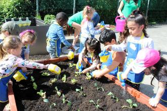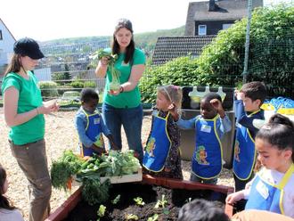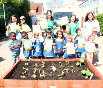 Im evangelischen Familienzentrum "Regenbogen" in Aßlar ging es am letzten Apriltag zur Sache: Zusammen mit Tea Toska und Nike Rohde von der Edeka-Stiftung wurde ein Hochbeet angelegt. Schon drei Mal hatte sich die KiTa beworben und jetzt hat es endlich geklappt. Mit dem Projekt "Gemüsebeete für Kids" will die Edeka-Stiftung den Jüngsten knackiges Gemüse und gesunde Lebensmittel schmackhaft machen. Und nicht nur das: Die Kinder lernen, wo und wie Gemüse wächst und wie viel Pflege es benötigt, bis aus einem kleinen Samen eine große Frucht wird. Damit soll wissenschaftlichen Erhebungen entgegen gewirkt werden, die beständig steigende Fettleibigkeit bei Kindern und Jugendlichen feststellen. Dass die Arbeit im Gemüsebeet auch noch Spaß macht und manche Kinder sich schon ganz gut mit Gemüse auskennen, konnten, Clara, Amelia, Abdhulla, Elisabeth und Co. eindrücklich darstellen. Zuerst bekam jedes Kind seine Gärtnerschürze und alle machten sich gemeinsam daran die Erde im Hochbeet aufzulockern, das eine kindgerechte Höhe hat. Dann wurden Paare gebildet, die als "Bagger" und "Kran" die Setzlinge in Reih' und Glied in die Erde brachten. Tea und Nike hatten Kohlrabi, Weißkohl, Blumenkohl, Kopfsalat, Gurken und Lollo Rosso mitgebracht. Mit der Hand wurden Löcher ausgehoben und die Pflänzchen fachgerecht in die Erde gebracht. Dabei lernten die Kinder, wie über die Wurzeln Wasser und Nährstoffe zum Wachsen beitragen und diese die Pflanzen im Boden festhalten. Warum man viel Gemüse essen soll, wussten viele schon: Gesund sein und bleiben, wachsen und stark werden, Vitamine zu sich nehmen und nicht zu dick werden. nach dem Pflanzen wurden an den Beeträndern noch Furchen gezogen, in die von den Kleinen Radieschen und Möhrensamen eingebracht wurden. Jedes bekam dann noch ein Gießkännchen und die erste Bewässerung erfolgte sehr gründlich. Abschließend wurden noch Pflanzschilder zu den Pflanzen gesteckt und gemeinsam ausgewachsenes Gemüse angeschaut, das Beetpate Alex Leipi beigesteuert hatte. Für jeden neuen "Minigärtner" gab es auch noch eine Urkunde der Initiative "Aus Liebe zum Nachwuchs" der Edeka-Stiftung und ein Eis zur Erfrischung und nun wird gespannt gegossen und täglich beobachtet, wie das Gemüse gedeiht und vor allem wann die Saat aufgeht. So steigt die Vorfreude auf die Ernte und den gemeinsamen Genuss.