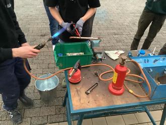 Daraufhin wurde geplant, gemessen, angerissen, abgelängt und entgratet und die alle hatten sichtlich Freude daran, etwas mit den eigenen Händen zu erschaffen. Das Löten übernahm dann aus Sicherheitsgründen Matthias Schneider höchstpersönlich.