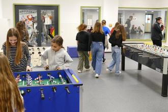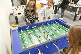 „Es hat nun leider doch etwas länger gedauert, bis wir die Spielebar für die Schülerinnen und Schüler eröffnen konnten, aber jetzt ist es endlich soweit“, verkündete Ganztagskoordinatorin Silke Riedl und gab somit den „Startschuss“ für ein weiteres Pausenangebot an der Johannes-Gutenberg-Schule. Unter dem Begriff „Spielebar“ hat sich im Laufe vieler Jahre ein Spiele- und Beschäftigungsangebot etabliert, das die Kinder und Jugendlichen in der Pause in Anspruch nehmen können. Angefangen vom beliebten Tischkicker über unterschiedliche Brettspiele bis hin zu Karten- und Gesellschaftsspielen gibt es alles, was das Schülerherz begehrt. Aber auch eine gemütliche Sitzecke oder Stehtische mit stylischen Hockern laden zum Verweilen und Entspannen ein. Um den Andrang etwas zu kanalisieren, gibt es eine ausgearbeitete Einteilung für die beiden großen Pausen. „Die jüngeren Jahrgangsstufen dürfen immer in der 1. großen Pause in die Spielebar, weil parallel dazu unsere Mediathek geöffnet ist. So können die Kinder entweder schmökern oder miteinander spielen. Die Größeren können immer in der 2. Pause vor Ort sein“, so Riedl. Dass diese Zeiten immer von einer Aufsicht begleitet werden, versteht sich von selbst. Colin Dietrich, der sein Freiwilliges Soziales Jahr an der JGS absolviert, ist hierfür der richtige Mann. „Es gehört auch zu der pädagogischen Begleitung von Colin Dietrich, dass bestimmte Projekte und Unterrichtsvorhaben zusammen mit ihm ausgearbeitet und durchgeführt werden. In seiner Zuständigkeit soll nun unsere Spielbar wieder die Bedeutung erhalten, die sie für unsere Schülerinnen und Schüler in vergangenen Zeiten immer hatte - ein bisschen Entspannung und Unterhaltung zwischen den Unterrichtsstunden“, so Riedl abschließend.