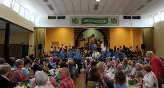 Nach der Pause ging es dann traditionell erst einmal mal mit dem Spielmannszug unter der Leitung von Armin Küster weiter, der von zwei jungen Damen unterstützt wurde, die den Altersdurchschnitt von rund 80 Jahren drastisch senkten. Mit den Märschen "Groß-Berlin" und "Waidmannsheil" wurde an alte Zeiten erinnert, als die Spielmannszüge noch die Turner bei Wettkämpfen begleiteten. Bei der Volksweise "Das Lieben bringt groß' Freud'" war die Blasmusik mit dabei, die bereits auf der Bühne Platz genommen hatte. Gänsehautstimmung pur war sicher - besonders, als "Dem Land Tirol die Treue" angestimmt wurde und die Männer des Spielmannszugs wieder sangen. Immer wieder ein Erlebnis und treue Fans begannen, die "Vogelwiese" einzufordern. Doch die Blasmusik übernahm zunächst das Spiel, geleitet von Dieter "Fussel" Schmidt und hatte zu Ehren des 100. Geburtstags von Ernst Mosch in 2025 einige seiner bekanntesten Stücke im Gepäck. Die "Kinder von der Eger" ließen den "Böhmischen Wind" wehen, den "Dompfaff" pfeifen und "Mein Herz schlägt nur für Dich" und die legendären "rauschenden Birken" durften auch nicht fehlen. Man hatte Mosch und seine Gesangspartnerin Barbara Rosen förmlich vor Augen - Hannah Esch und die Chefin der Blasmusik, Yvonne Esser, übernahmen den Gesang adäquat. Dazu kamen noch die "Kinderaugen" von Wenzel Zittner, Karel Vaceks "Kannst Du Knödel kochen" und die "Fuchsgraben"-Polka und Zittners "Bis bald auf Wiedersehn" folgten dann der "Böhmische Traum" (Norbert Gälle) und natürlich die legendäre "Vogelwiese" von Josef Poncar, der ebenfalls zu den ganz Großen der Böhmischen Blasmusik gehört. 41 Musiker*innen hatten einmal mehr mit Leichtigkeit die TV-Halle in Schwung gebracht, es wurde sogar getanzt, und das bestens gelaunte Publikum jubelte den klangstarken Damen und Herren zu.