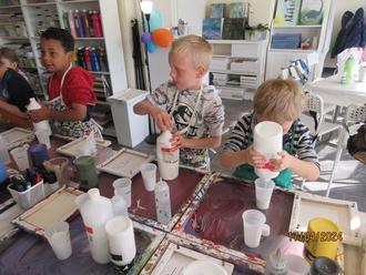 Hier konnten die Kinder verschiedene Mal- und Basteltechniken ausprobieren und auf diese Art ihre ganz eigenen Kunstwerke entstehen lassen. So bastelten sie etwa Schlangen aus Plüschdraht und versuchten sich im „Stopp Malen“. Besonders angetan hatte es Kindern und Erzieherinnen gleichermaßen die Fließtechnik. Mit dieser Methode gelang es ganz ohne Pinsel - nur mit Becher, Farben und der richtigen Technik - tolle Bilder auf die Leinwand zu zaubern.
