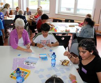Der Austausch der Generationen steht im Blickpunkt des Schulcafés an der Grundschule Aßlar, dessen jüngste Ausführung am Donnerstag in der Aula der Schule unter dem Motto "Zusammen spielen" stand. Gastgeber ist der "Pakt für den Ganztag", also die Schulbetreuung, deren Leiter Thomas Müller die zahlreichen Gäste begrüßte, zu denen auch die Damen vom Seniorencafé im Kuba, die Seniorenbeiratsvorsitzende Hannelore Spengler und Bewohner des benachbarten Werner Best-Hauses zählten. "Das Schulcafé ist für mich eine tolle Idee der Schulleiterin Barbara Ernst-Spory, da die Ältesten und Jüngsten Aßlarer hier voneinander profitieren können", so Stadtjugendpfleger Karsten Müller, der mit seinem Team vom Familienzentrum in der Kontakt- und Beratungsstelle für alle Generationen da ist. Die Teilnehmer kommen ins Gespräch, lernen einander kennen und erleben gemütliche und quicklebendige Stunden miteinander. Die Betreuungskinder hatten dieses Mal sogar gebastelt und boten Eulen, Glückswürmer und andere Bastelsachen an, die man auch per Tombolalos gewinnen konnte. Und an den Tischen wurde dem Motto entsprechend natürlich auch gespielt. Ob "Memory", "Schnapp, Land, Fluss", "Tantrix" oder "Djenga" - Gesellschaftsspiele aller Art gab es zur Auswahl und jede Menge Spaß war vorprogrammiert. Das "Aßlarer Schulcafé" findet alle drei Monate statt und bietet für Bürger*innen auch die Möglichkeit, sich die Veränderungen der vergangenen Jahre und natürlich auch die aktuellen Entwicklungen - baulich und pädagogisch - anzuschauen. Dabei sind Schulführungen inklusive. Ein interessantes Angebot, denn es tut sich viel. Aus dem alten Feuerwehrhaus, das lange Jahre als Kinderhort "Blauland" diente, ist zum Beispiel die Mensa geworden, die mit Nebenräumen inklusive Anbau eines Küchengebäudes in der Fertigstellung ist. In den Sommerferien soll das Hausmeisterhaus abgerissen werden, in dem bis vor einem Jahr noch die Mediothek untergebracht war, die mittlerweile unter dem Dach des Altbaus untergebracht ist. Die Betreuung, die momentan zum Teil in Containern "zuhause" ist, wird in einem Betreuungshaus Platz finden, für das im Januar 24 Planungsbeginn war - je nach Baugenehmigung ist die Fertigstellung in 18 Monaten geplant. Aßlar hat mit 460 Schüler*innen die größte Grundschule im Lahn-Dill-Kreis und es gibt immer spannende Neuigkeiten und Unterstützer - finanziell und mit helfenden Händen - sind immer gerne gesehen. Das Aßlarer Schulcafé ist also eine hervorragende Plattform, um am Ball zu bleiben und diese pulsierende, sehr lebendige Einrichtung unter dem Motto „Wir in Aßlar“ selbst im Auge zu behalten.